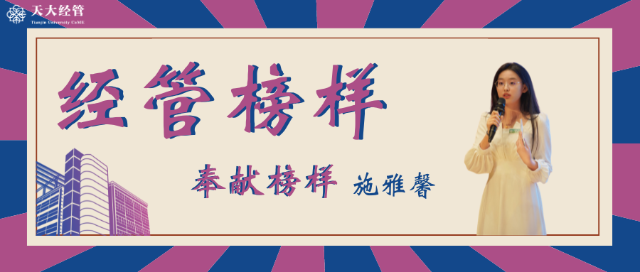 博学而慎笃行,方能不负家国,在成长的道路上,施雅馨始终以这句话提醒自己,也希望学弟学妹们能在天大经管找到属于自己的路,绽放独一无二的经彩青春!