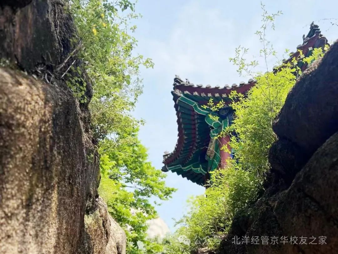 上午9时,校友们齐聚有“京西小黄山”美称的凤凰岭山脚。恰逢京城一场春雨过之后,凤凰岭的空气分外清新,浸润在浓度达市区150倍的负氧离子中,校友们走过长长的林荫道,率先向被誉为华山之险的“天梯”进发。这条近乎垂直的崖壁栈道镶嵌在花岗岩山体间,校友们手脚并用地攀越铁索,耳畔是山风掠过千年古松的簌簌声。沿陡峭的“天梯”向上,途经“奇石阵”“仙人洞”等标志性景观,奇山、怪石、林海、神泉等自然奇观与千年人文积淀,一幅独特的山水画卷缓缓向我们展开。