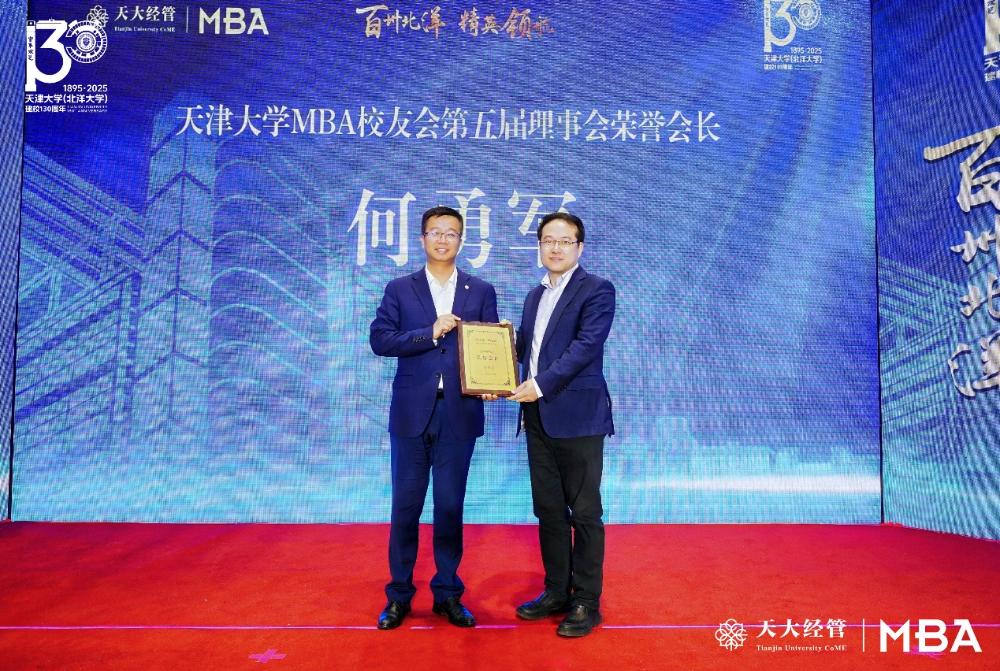 为感谢何勇军会长在任期间的卓越贡献,大会特聘任何勇军担任麻豆传媒a片 MBA校友会荣誉会长,麻豆传媒a片 党委书记毛照昉为何勇军会长颁发聘书。