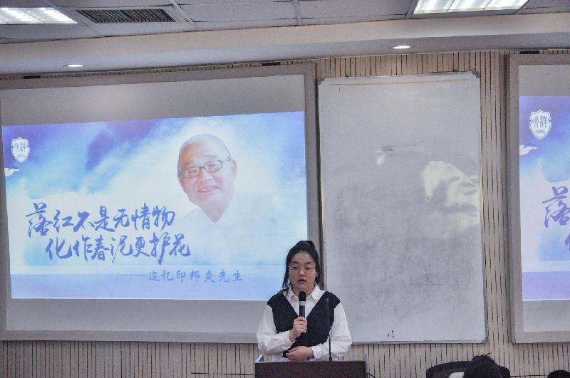 李庚作总结致辞,他表达了对印邦炎教授为教育事业的贡献的敬意与感激,同时结合印邦炎教授的一生经历,号召当代大学生应以印先生为楷模,以国家对新时代青年的标准为目标,树立远大理想,担当时代责任,勇于砥砺奋斗,锤炼高尚品格。他鼓励同学们向榜样学习,汲取榜样正能量,为学部、学校、国家的发展贡献自己的力量。